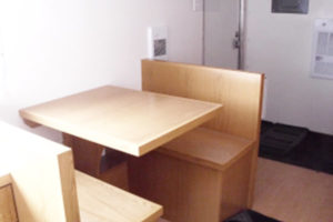 - Long desk with drawer banks , long countertop above fridge, nose desk with drawer bank, made from birch wood and industrial Lino counter tops.